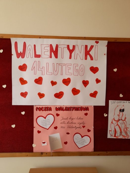 15.02.2021 w naszej szkole organizowana byłam poczta walentynkowa. Uczniowie przez cały tydzień tworzyli listy w kształcie serduszek i wrzucali je do specjalnie przygotowanego pudełka, ktore znajdowało się obok gazetki walentynkowej. Na gazetce ściennej mogliśmy również przeczytać wierszyki miłosne. W poniedziałek samorząd uczniowski z przewodniczącą Irminą roznosił liściki i słodycze.